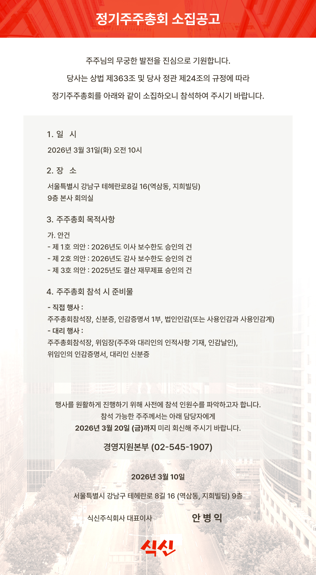2026년 3월 31일(화) 정기주주총회 소집 공고