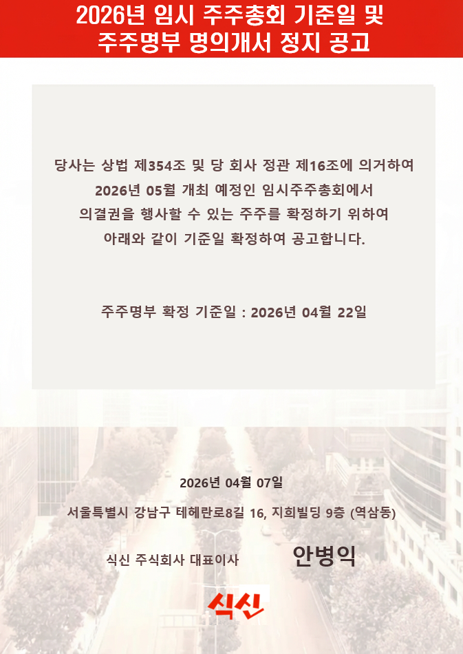 2026년 임시 주주총회 기준일 및 주주명부 명의개서 정지 공고